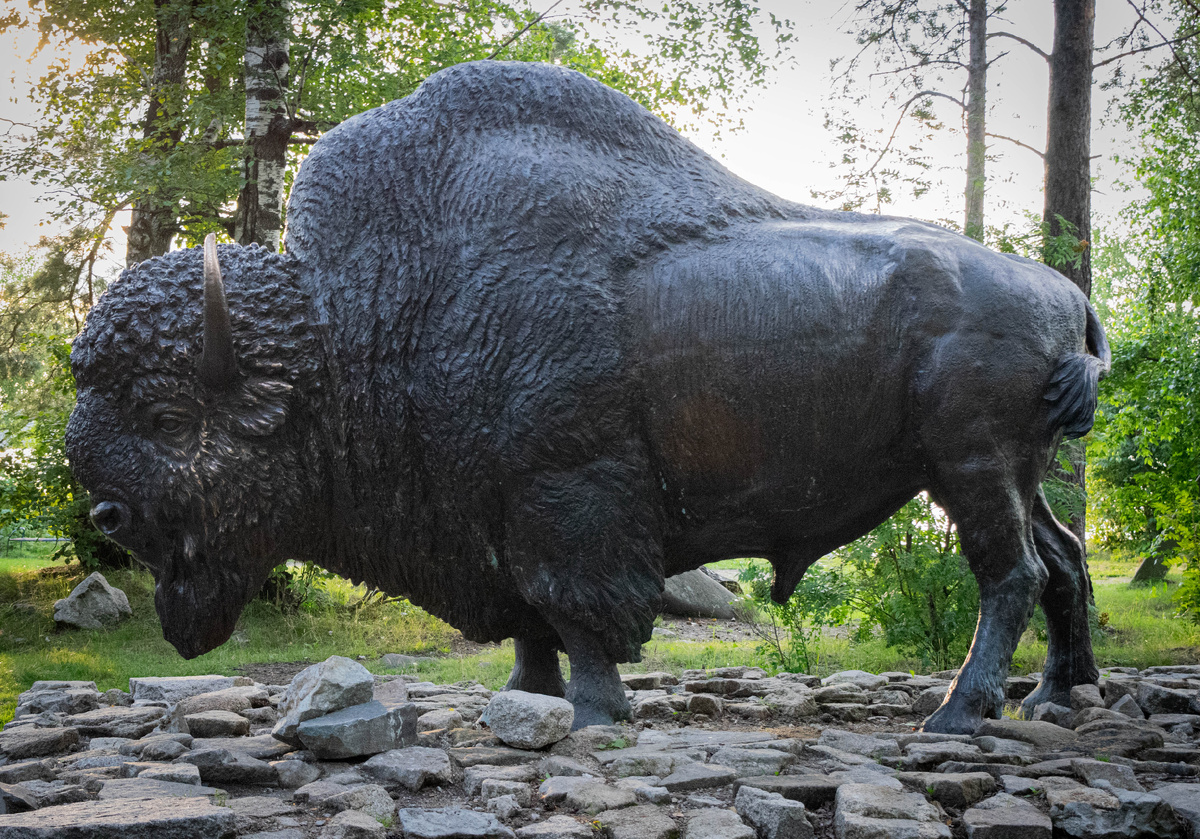 Озеро Шарташ образовалось около 1 млн лет назад. В 1745 крестьянин Ерофей Марков открыл первое в России рудное золото. В 2021 парк у озера наконец-то облагородили. Как говорится: "Поспешишь - людей насмешишь". Если без шуток, сделали классно: велодорожка, турники с брусьями и скамейки на местах для отдыха, цивильные платные нужники и даже кофейню поставили. "Це шо Европа?" В связи с этим, количество и качество моих велопрогулок возросло, как и количество людей захотевших присоединиться ко мне. Не так давно, наш quartetto доехал до конца велодорожки и встал перед выбором: "Прямо пойдешь - на ЖБИ попадешь; Налево пойдешь - с прорезиненной красной трассы сойдешь; Направо пойдешь - в деревянный вазон с кустами въедешь." Общим решением было поехать налево. По асфальтированной дороге, проходящей вплотную к озеру, мы доехали до пляжа на котором, неожиданно для меня, стояли бронзовые скульптуры доисторических животных в натуральную величину. Мамонты, пещерные львы, бизон, носорог, олень. Черн