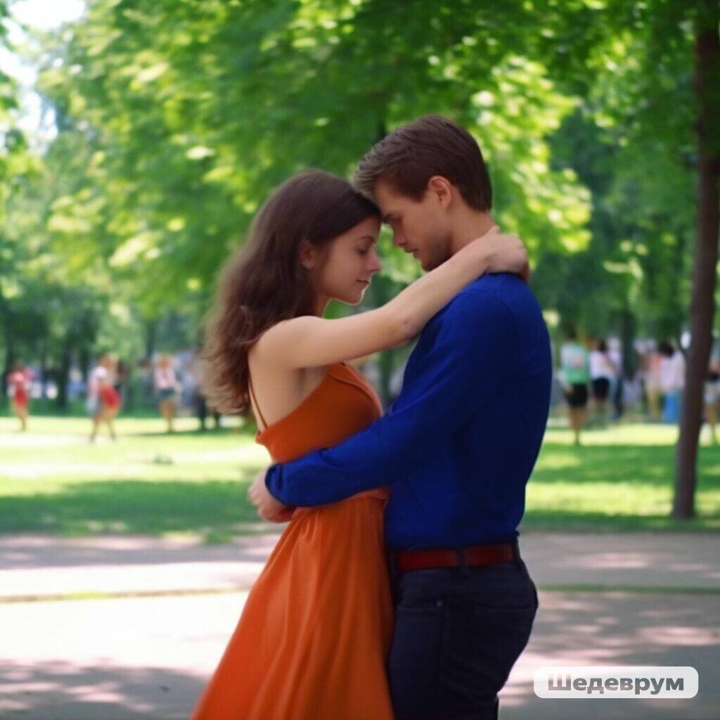 И вот наконец то последний стежок и... теперь картина оказалась завершённой: синее небо, яркое солнце, лёгкие, белые облака, парк, вокруг кудрявые деревья и яркие цветы. А в середине картины красивая хрупкая девушка танцует медленный танец с голубоглазым юношей, который бережно держит её за талию....