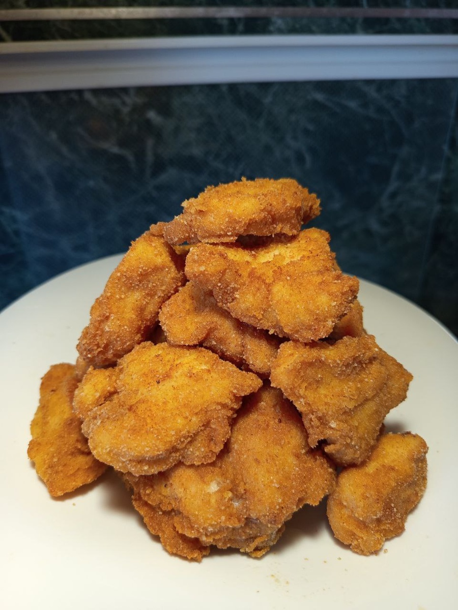 Наггетсы очень легко и быстро готовятся, их любят в каждой семье. Особенно дети, которые далеко не всегда соглашаются кушать натуральное мясо. Но от наггетсов ещё никто не отказывался! На мой взгляд, в этом случае, главное - сделать вкусную панировку. Конечно, в идеале лучше всего готовить наггетсы из куриной грудки. Но если семья большая и хочется немного сэкономить, то можно использовать и всю курицу — главное, правильно её нарезать. Один из вариантов приготовления, который нам понравился — вместо панировочных сухарей использовать кляр. Поверьте, получается очень вкусно! Ингредиенты: куриная грудка, смесь для крылышек, соль, перец по вкусу. Если используете всю курицу, тогда лучше всего мясо полностью отделить от костей. Приготовление. Куриное филе разрезать небольшими квадратами 6х6 см, толщиной 3-4 мм. Чтобы приготовить кляр, в панировочную смесь в глубокой миске наливаем остывшую кипячёную воду (комнатной температуры). Взбиваем до получения однородной жидкости. По густоте смесь