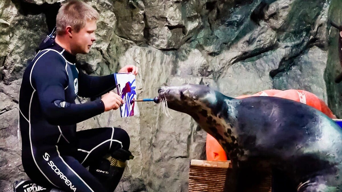 В Санкт-Петербурге живет единственный в России тюлень-художник. Умка создает картины и занимается под руководством тренера. Усатую художницу зовут Умка. Ее совсем малышкой, истощенную и израненную, нашли на берегу Финского залива сотрудники Петербургского океанариума, выходили, выкормили и полюбили. «Учили плавать ее, вместе погружались с ней как с маленьким ребенком, держали ее и в костюме погружались, после молока начинали приучать к рыбке», — рассказал водолаз-тренер Андрей Смуров. Рисовать ластоногой художнице непросто: из всех тюленей океанариума такой талант есть только у нее. Умка дружит с Гошей и Дашей. У Гоши обнаружились музыкальные способности, он играет на гитаре и профессионально качает пресс. «Они с виду такие милые, большие глазки, влюбляешься в эти глазки красивые, но за этими глазками бывают острые зубки», — отметил Андрей Смуров. Андрей Смуров и его коллеги принципиально называют себя не дрессировщиками, а тренерами тюленей, это особый подход и своя философия. «Дресси
