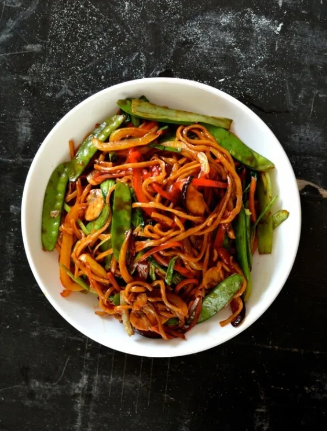 Овощи тщательно промойте, морковь очистите от кожуры, сладкий перец от семян, а с зубчиков чеснока снимите шелуху. Затем порежьте все подготовленные ингредиенты тонкими полосочками (соломкой). Кроме стручкового горошка, его достаточно будет промыть и обрезать кончики.