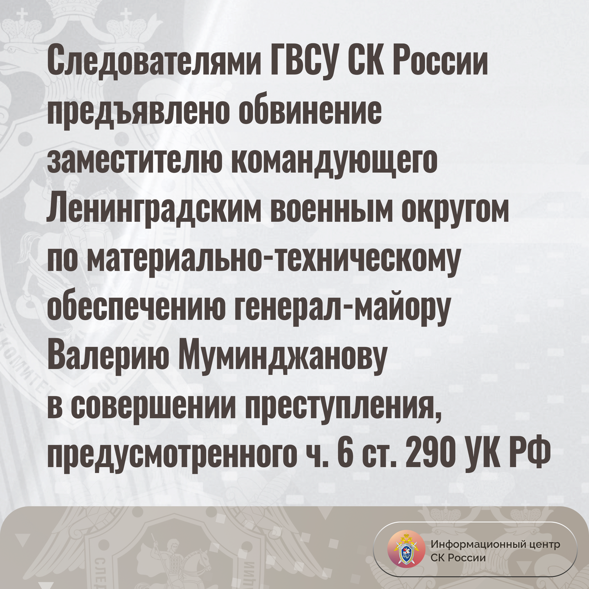 Следователями Главного военного следственного управления СК России предъявлено обвинение заместителю командующего Ленинградским военным округом по материально-техническому обеспечению генерал-майору Валерию Муминджанову в совершении преступления, предусмотренного ч. 6 ст. 290 УК РФ (получение взятки в особо крупном размере).