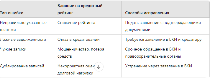 Автор: Фаиль Габбасов - юрист по решению проблем с кредитной историей, банками и БКИ, с опытом работы с 2015 года. Ошибки в кредитной истории могут серьезно повлиять на ваши финансовые возможности, включая получение кредита, ипотеки или даже арендное жилье. Важно вовремя выявить и исправить такие ошибки, чтобы улучшить свою кредитную историю и избежать негативных последствий. Ошибки в кредитной истории могут включать неправильно отраженные платежи, ложные задолженности или даже данные о других людях. Вот основные причины, почему необходимо заниматься исправлением таких ошибок: Первый шаг — это проверка вашей кредитной истории. Вы можете бесплатно запросить кредитный отчет из любого бюро кредитных историй (БКИ). Рекомендуется проверять кредитную историю хотя бы раз в год. После получения отчета, внимательно изучите его на предмет ошибок, таких как: Для исправления ошибки необходимо подготовить заявление. В нем должны быть указаны: Заявление об ошибке следует отправить в соответствующее