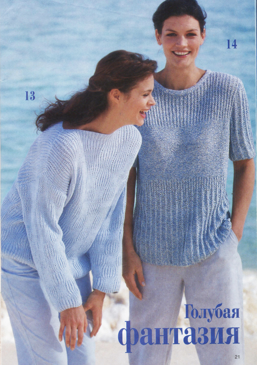 Вам потребуется: 550 (600) г голубой пряжи Elastico (96% хлопка, 4% полиэстера, 160 м/50 г); спицы № 4. Основной узор: вязать по схеме; в изн. р. петли вязать по рисунку, петли в прокол вязать изн.
