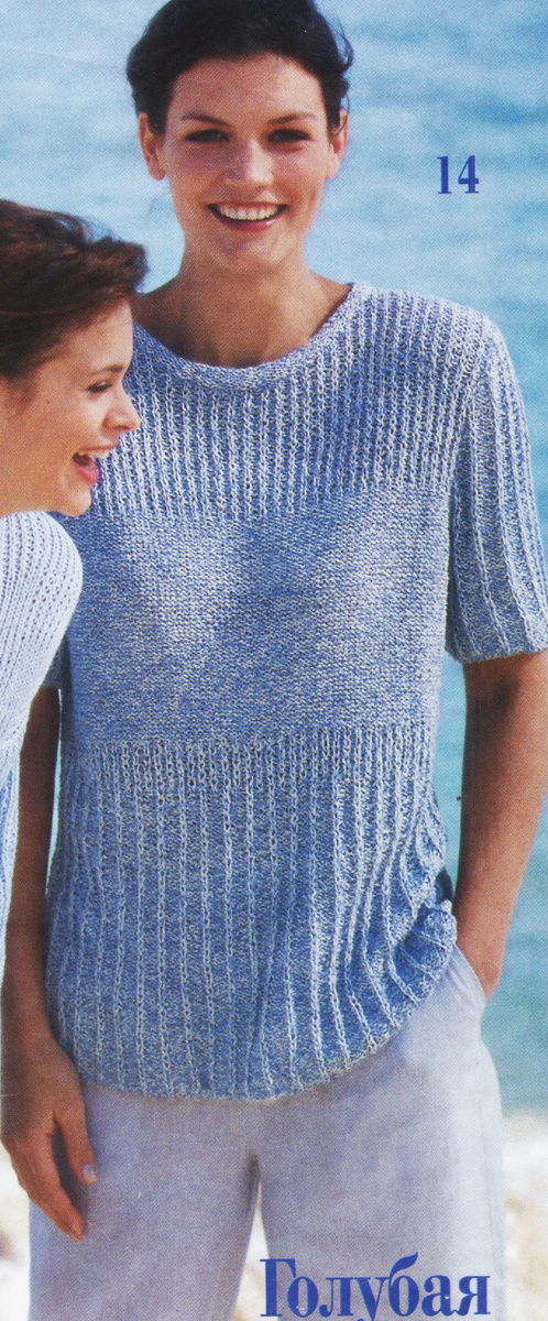 Вам потребуется: 400 (450) г голубой пряжи Seta (65% шелка, 35% полиамида, 120 м/50 г); прямые и круговые спицы № 4.