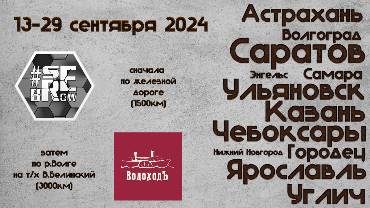 Огромное путешествие впереди. Сначала едем поезд в город Саратов, попробуем там раков, а также посетим важнейшее место в истории нашей страны. Далее отправимся на юг страны в рыбный край- Астраханскую область. Попробуем отведать там чёрной икры, ну и воблы, куда же без нее. А! Н у конечно же арбузов. Ну а дальше нас будет ждать Великая Русская Река - Волга. Почти пройдем ее всю. От устья до истока. 12-ти дневный круиз на теплоходе В.Белинский.