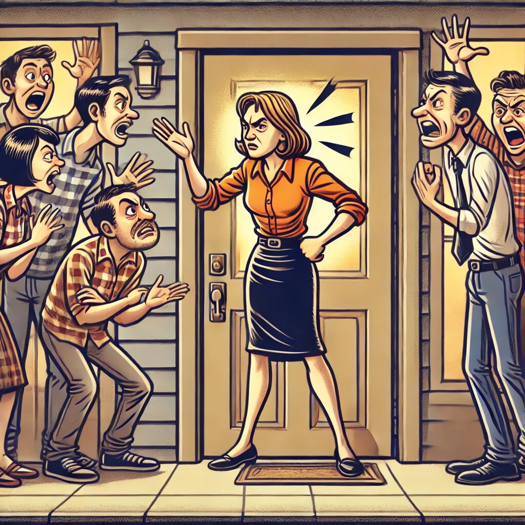 Отношения с соседями порой бывают полны конфликтов и недоразумений, и в центре этих ссор часто оказывается сварливая женщина, которая всегда найдет повод для недовольства. Но, несмотря на это, такие ситуации могут быть источником безграничного юмора.