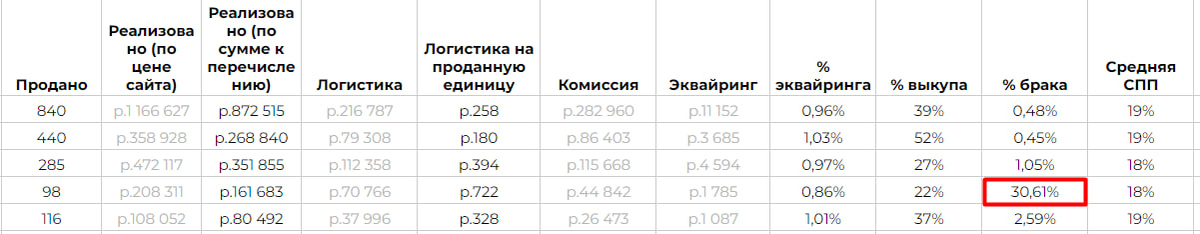 Оказалось иначе – треть товаров вернулась к нему в виде брака. Потери на этих товарах - себестоимость, логистика к клиенту, логистика по браку. Итог - маржинальность по проекту (артикулу) уменьшилась, как минимум в два раза