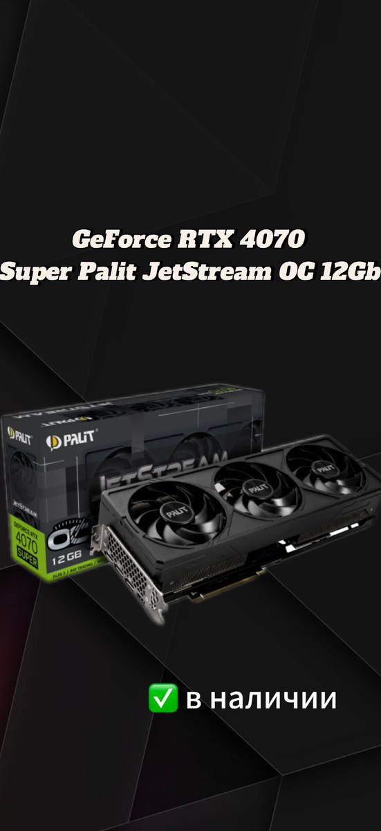 Сегодня каждый геймер и энтузиаст ПК стремится получить максимальную производительность, чтобы полностью раскрыть возможности современных игр и приложений. Видеокарта **Palit GeForce RTX 4070 SUPER JetStream OC** — это ответ на эти требования. Благодаря высокопроизводительному чипу и продвинутым технологиям охлаждения, она позволяет играть на самых высоких настройках графики без малейших проблем. И что самое важное — эту мощную видеокарту можно приобрести в **CompDay**. **Технологии на переднем крае** Видеокарта оснащена **видеопроцессором GeForce RTX 4070 SUPER**, который создан на основе микроархитектуры **NVIDIA Ada Lovelace** с использованием 5-нм техпроцесса. Это означает не только высокую производительность, но и энергоэффективность, что особенно важно в современных системах. ▪️ **Графический процессор** имеет базовую частоту 1980 МГц, но в режиме турбо может разгоняться до впечатляющих 2640 МГц. Эта высокая тактовая частота делает карту идеальной для работы с высокопроизводи