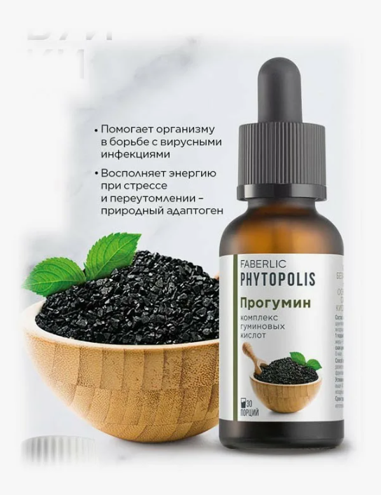 «Прогумин» - это концентрат напитка на основе комплекса гуминовых кислот от бренда Faberlic. Нужен для: * Снабжения организма недостающими компонентами для борьбы с внешними инфекциями. * Улучшения работы всех систем в организме. * Восполнения энергии при стрессе и переутомлении (природный адаптоген). Способ применения: 1 мл (10 капель) концентрата развести в 200 мл питьевой воды или фруктового сока. Принимать 1 раз в день. Перед применением любых добавок необходимо проконсультироваться со специалистом. Группа в ВК: https://vk.com/faberlic_vkirove Написать мне: https://vk.com/lyapunova_elena Актуальный каталог и регистрация тут: https://promofaberlic.com/737221524/catalog/sebe