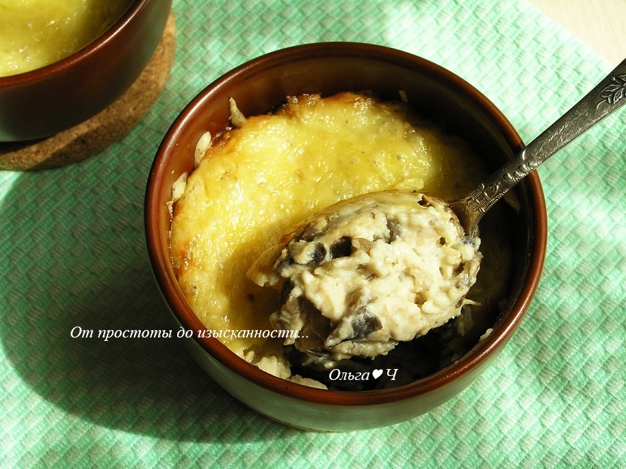 Обжарьте мелко нарезанные лук и грибы на растительном масле, пока не испарится лишняя жидкость. Куриное филе отварите до готовности. В другой сковороде пару минут обжарьте муку (без масла!), затем постепенно влейте сметану, постоянно помешивая. Посолите, поперчите, добавьте мускатный орех. Снимите с огня. Куриное филе нарежьте маленькими кусочками, смешайте с приготовленными грибами и соусом. Разложите по порционным формочкам (в идеале кокотницам, у меня на тот момент их еще не было), посыпьте тертым сыром. Запекайте пр