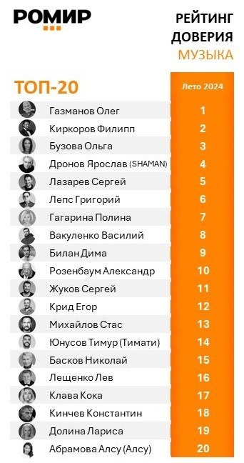 Также в десятке лидеров отметились такие музыкальные деятели, как Ярослав Дронов (SHAMAN), Сергей Лазарев, Григорий Лепс, Полина Гагарина, Василий Вакуленко (Баста), Дима Билан и Александр Розенбаум.