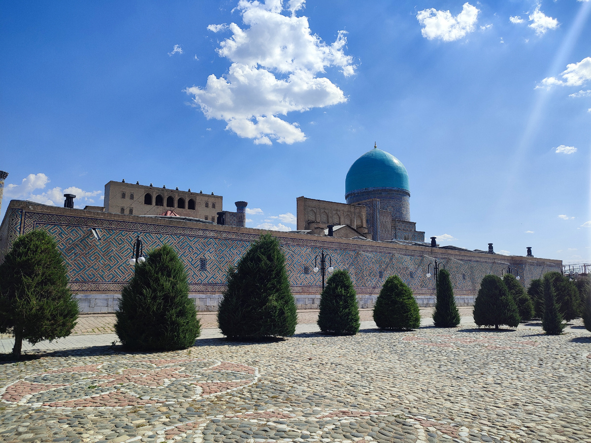 Здравствуйте, дорогие читатели. Пора рассказать про моё летнее путешествие в Среднюю Азию — Узбекистан и Таджикистан. Прилетев в Узбекистан, в город Самарканд, я заселился в отель в старом городе недалеко от Регистана (центральная часть исторического центра). Перелёт туда-обратно из Минеральных Вод вместе с багажом обошёлся в 25000р., номер в отеле $22 в сутки. Номер без излишества, но всё, что нужно, есть. К тому же, завтрак включён в стоимость. Кстати, о еде: здесь она очень вкусная и дешёвая, по крайней мере, по сравнению с Кавказом. Вот, например, поход в ресторан (да, именно ресторан, а не просто кафе) с огромной порцией салата Цезарь, пятью мантами, лепёшкой и литровым чайником зелёного чая обошёлся на наши около 900 рублей. Такси из аэропорта в центр - $1. Короче, здесь всё намного дешевле. Ну и, конечно же, после плотного позднего обеда самое время прогуляться в Регистан... Регистан (узб. Registon; от перс. рег — песок и стан — место; буквально — место, покрытое песком)