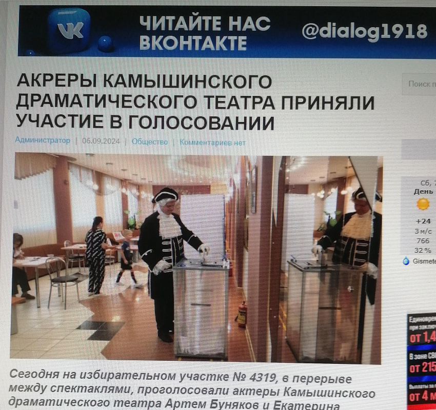 Вчера, 6 сентября, на избирательном участке № 4319, в перерыве между спектаклями, проголосовали за губернатора и депутатов Облдумы странно наряженные персонажи. Как сообщает (с досадной ошибкой прямо в заголовке) административная камышинская газета "Диалог", "выходцами" с фантастического "острова сокровищ" оказались актеры Камышинского драматического театра Артем Буняков и Екатерина Бородулина. Маскарад у избирательных урн газета мэрии объясняет так: - Артисты задействованы в постановке «Сокровища капитана Флинта», они пришли в своих сценических костюмах, чтобы исполнить гражданский долг. «Будущее города, региона создается руками жителей волгоградской земли, поэтому ни в коем случае нельзя оставаться в стороне», – сказали газете актеры. "Также они отметили, что рады были поднять настроение всем камышанам, кто их увидел, на столь важном мероприятии", - добавляет газета "Диалог". Чем именно было поднято настроение голосующих, не уточняется. Видимо, идеей поиска чужих сокровищ. Мария Але