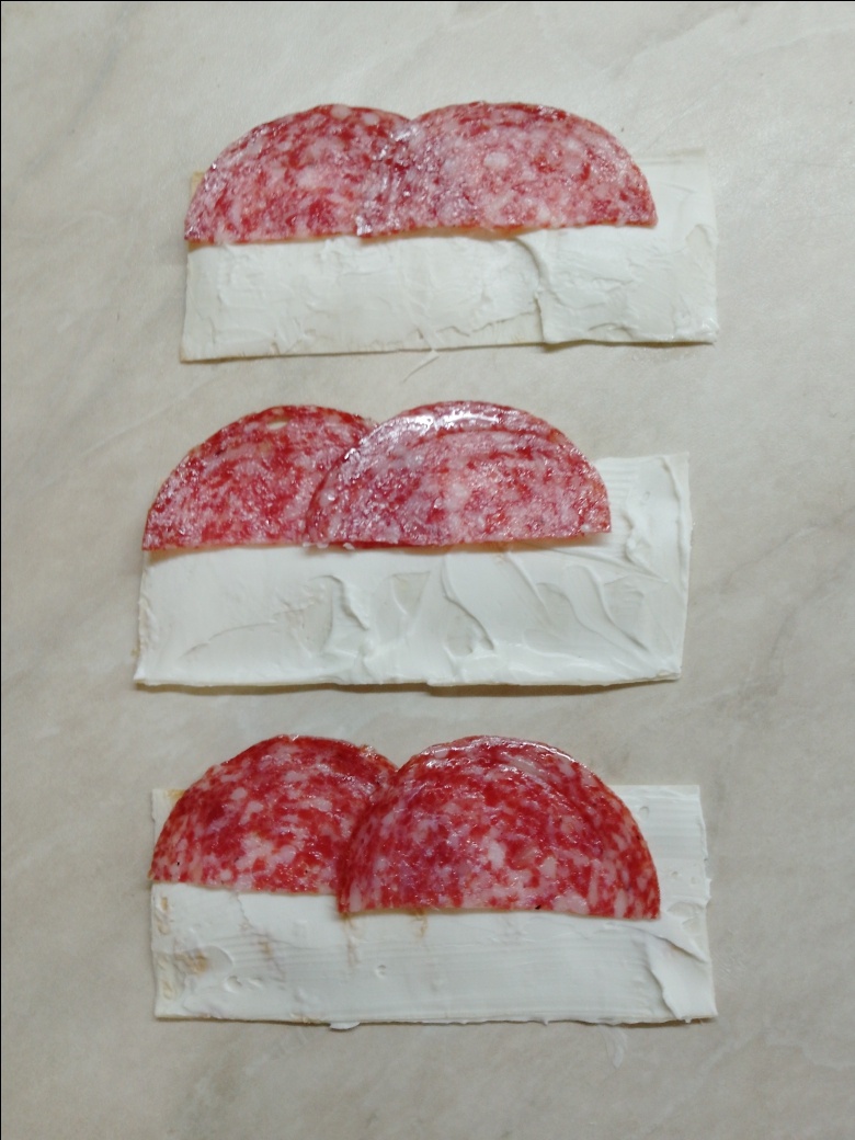 Канапе из лаваша, колбасы и оливок / маслин с тво родным сыром.