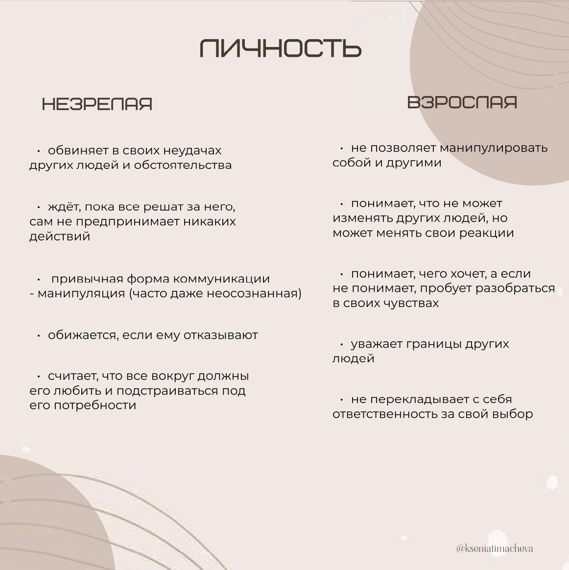 Но как на самом деле понять, что в определённой сфере жизни вы находитесь в детской позиции? Это не значит, что всё в жизни идёт не так, но есть несколько сфер, которые могут проседать именно из-за этого. Вот несколько критериев, которые помогут вам осознать, что вы всё ещё в детской позиции: 👉Зависимость от других людей Если вы склонны сливаться с другим человеком, зависеть от его настроения, эмоций или мнения, боитесь его потерять — это явный признак детской позиции. Вы чувствуете, что без него ваша жизнь потеряет смысл. 👉Нужда в одобрении извне Если вам нужно получить подтверждение от других, чтобы чувствовать уверенность, например, перед покупкой платья вы советуетесь с десятью людьми — это показатель того, что вы не можете принимать решения самостоятельно. А если кто-то усомнится в вашем выборе, вы начинаете сомневаться сами. 👉Отсутствие действий для изменений Если вас не устраивает текущее положение, но вы ничего не предпринимаете для изменений — это тоже детская позиция. Взро