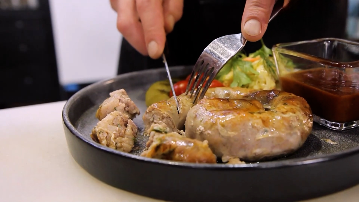 Наступила календарная осень, теперь на смену легким летним закускам приходят полноценные сытные блюда. И всегда есть возможность попробовать что-то новое и разнообразить повседневное меню. Можно обратить внимание на немецкую кухню. А точнее – на знаменитые колбаски. Вариаций их приготовления существует множество. Вместе с шеф-поваром приготовим свою версию осенней закуски. Баварская кухня подарила миру более сотни уникальных рецептов и не меньше разновидностей всем известных колбасок. Для нас это блюдо основное, обычно подают его на обед или ужин. Для немцев, наоборот, это всего лишь утренняя закуска. Но зачем нам повторять, если можно придумать свой авторский вариант. Прямо сейчас и покажем! Сначала выбираем подходящее мясо. У нас свинина, примерно 600 граммов, этого хватит на 3-4 порции. «Мясо выбираем довольно жирное, шейку, я сегодня взял лопатку, видите, здесь жир прям присутствует, это даст сочность нашим колбаскам, если мы будем использовать постное мясо, то колбаски будут сухов