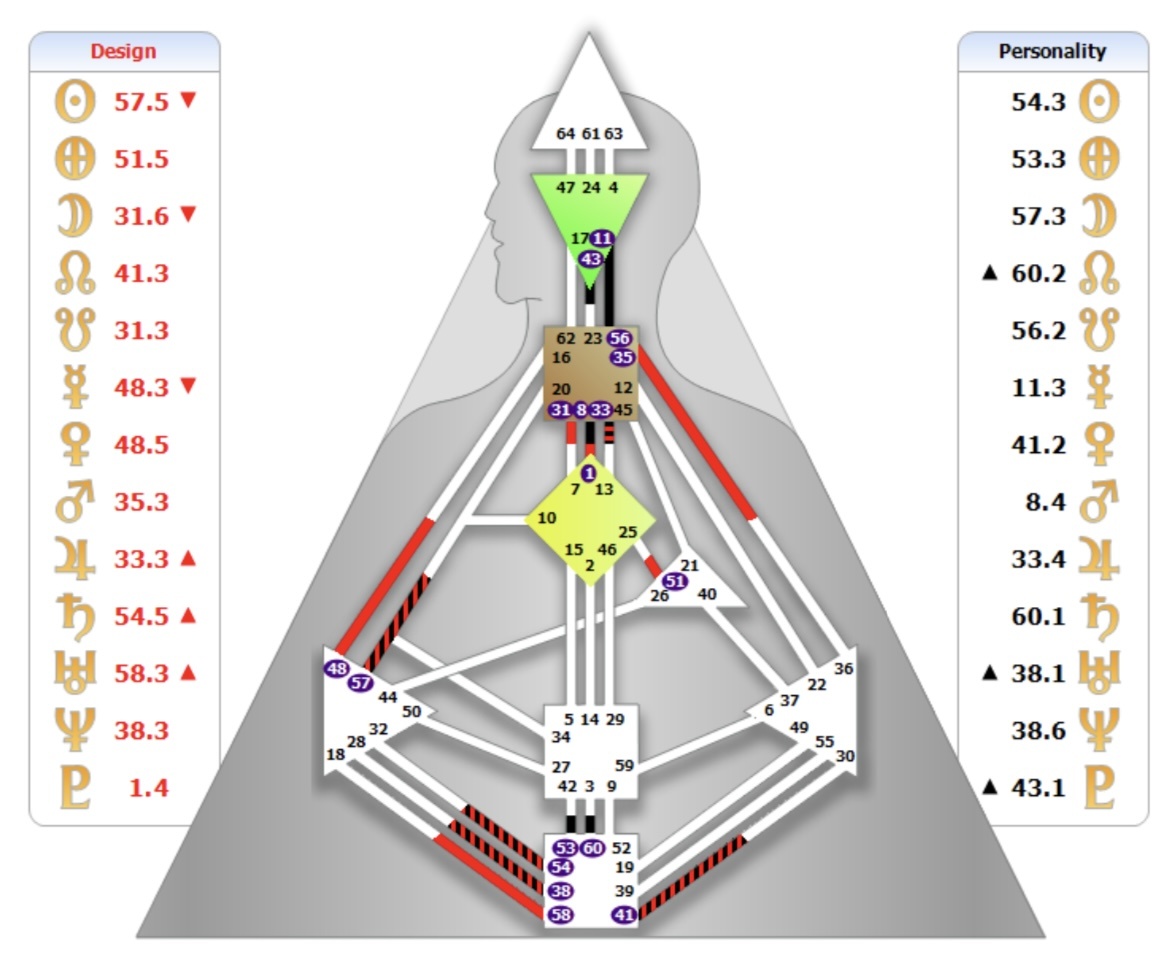 На бодиграфе отображены геометрические фигуры. Это энергетические центры, которые обрабатывают информацию и энергию. В фигурах отображены цифры это ворота- вход в центры. Они же указаны в столбиках слева и справа- числа до точки. Столбик с черными цифрами и значками планет это отпечаток характеристик, полученный в момент рождения. Столбик с красными цифрами это отпечаток полученный примерно за 3 месяца до рождения. Когда активированные ворота встречаются, то образуется канал. Это жизненная сила.