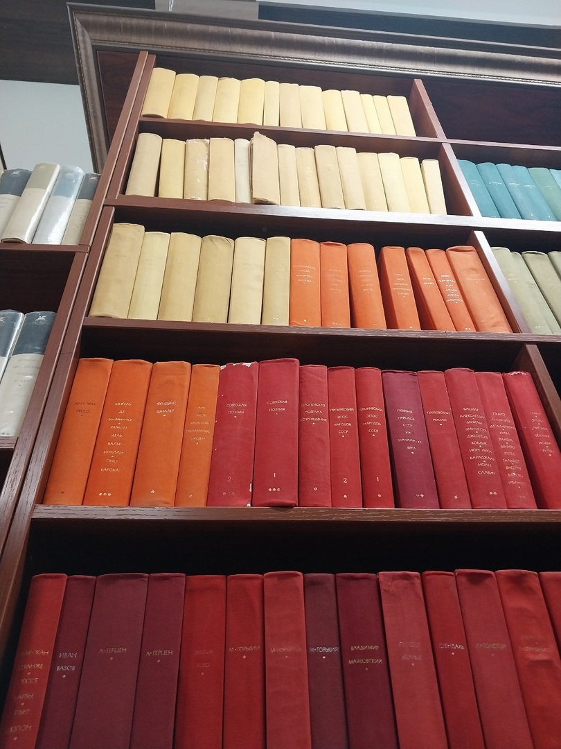 В итоге нам просто сказали неправильный номер, и водитель сам нас нашёл. Но почему-то туристов это всё очень развеселило. И тот факт, что они жили в "Атласе" и специально ехали в центр, а я специально ехала в центр из букинистической лавки всё от той же Депутатской: Мне очень нравится, что в букинисте сообразили расставлять книги как одежду в магазине - по цветам:) Вообще я ходила за любимым Томасом Гарди. Приобрела за сто шестьдесят рублей книгу с говорящим названием "Отчаянные средства" (мне достался перевод "Стеснённые средства"). Пока всё нравится: и брат с сестрой, которые ради заработков нанимаются в разнообразные места и... девушке "повезло" попас