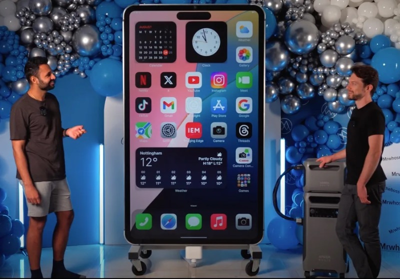Создать точную копию какого-либо смартфона своими руками — весьма непростая задача. Если же говорить об увеличенной в десятки раз копии, способной выполнять почти все функции оригинала, то это может оказаться ещё более сложной задачей. Тем не менее, YouTube-блогеры Мэтью Перкинс (Matthew Perkins) и Арун Майни (Arun Maini) сумели создать огромную рабочую копию Apple iPhone 15 Pro Max высотой 1,82 м и весом чуть менее 200 кг. Это достижение принесло блогерам официальный мировой рекорд Гиннесса. Источник изображения: YouTube Перкинс начал сборку огромной копии iPhone с подготовки экрана, для чего 88-дюймовый OLED-телевизор LG Signature был преобразован в отзывчивый сенсорный дисплей. Для этого он задействовал сенсорную плёнку аналогичного с телевизором размера, приклеив её с помощью клея на основе УФ-эпоксидной смолы. Следующей задачей было найти способ разместить внутри корпуса негабаритные компоненты смартфона: динамики, камеры, кнопки громкости и питания и др. Для этого была изготовлен