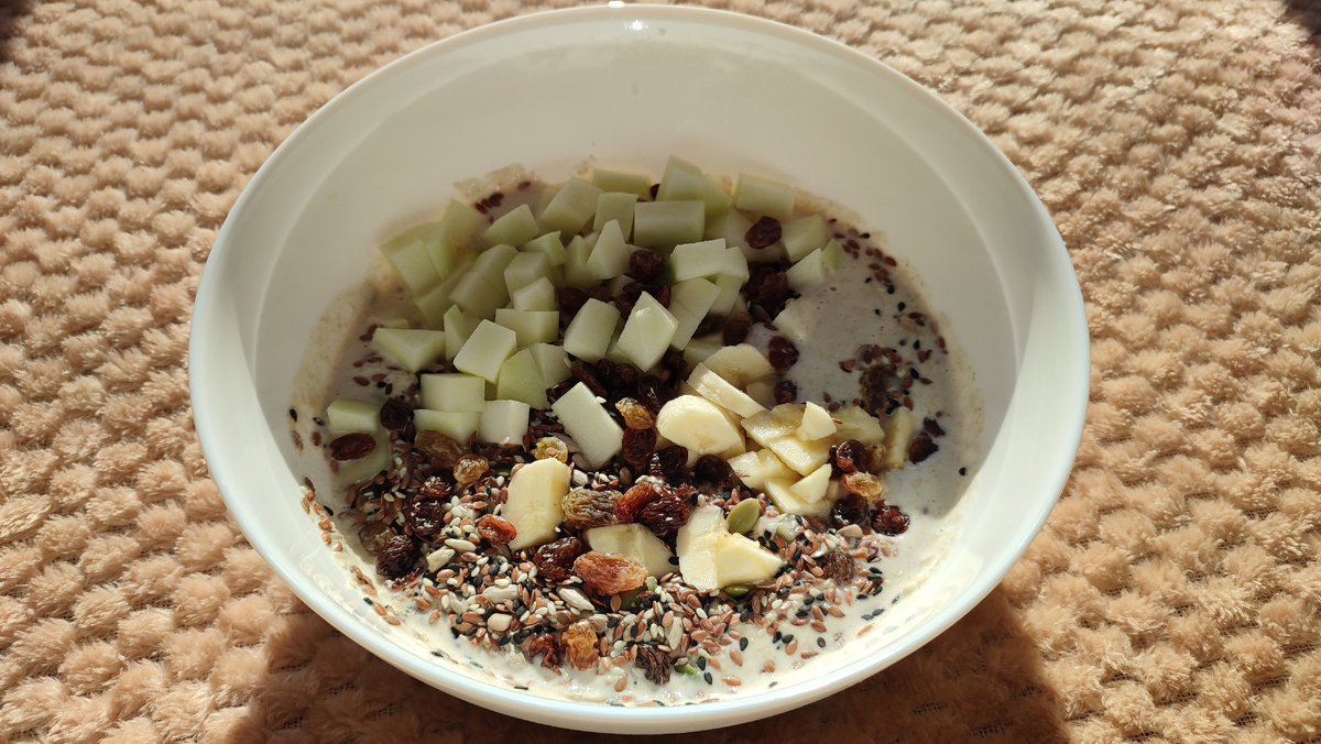 Сверху посыпаю набором семян (кунжут, лён, подсолнечник , тыквенное семя) . Режу оставшуюся половину яблока, половину банана и посыпаю горсточкой изюма.