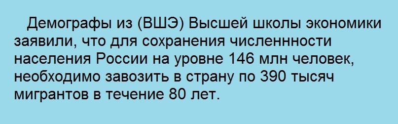 Совершенно случайно попались мне расчёты исследователей ВШЭ, всей душой радеющих за будущее России. Учёные Высшей школы экономики считают, что без постоянного притока в страну мигрантов, решение демографической проблемы в России невозможно. Несмотря на шутливый заголовок статьи, я смотрю на предложенную задачу вполне серьёзно. Начнёте решать задачу - и, думаю, сразу согласитесь со мной. Итак, условие задачи. Дано: ввозить по 390 000 мигрантов в Россию ежегодно; ввозить в течение 80 лет. ___________________________________________________________ Вопрос: 1) Сколько мигрантов будет завезено в Россию за 80 лет (без семей и детей)? 2) Какой процент это составит от 146 млн. человек (условно постоянная цифра населения России)? 3) Сколько мигрантов будет в России через 80 лет, если они ещё и "размножатся" здесь в 2 раза? в 3 раза? А о том, что приезжие в нашу страну любят заводить многодетные семьи (и получать в России социальные пособия на детей) рассказано здесь: Я ещё не дописала фразу