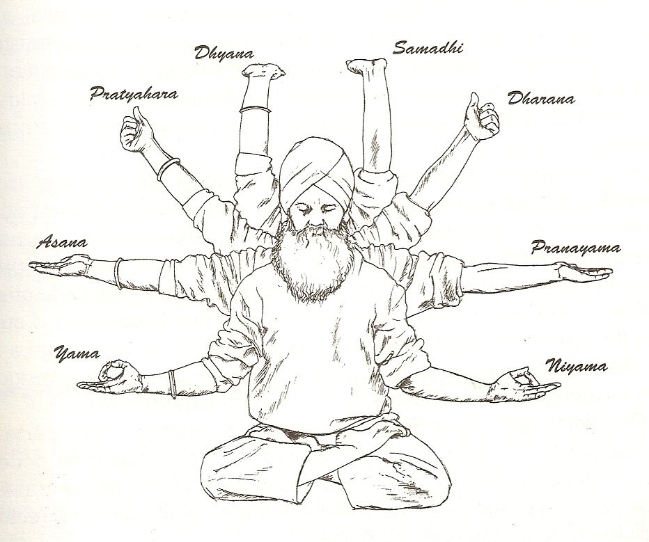 - 8. Самадхи. Это состояние единения со Всевышним, возникающее в результате медитативного расширения сознания. В нем приходит осознание Единства, а разделенность и двойственность мира растворяются в тишине ума, в ощущении завершенности. Индивидуальность йога при это сохраняется. Практикующий на этой ступени слился с аспектом своей истинной природы. Человек осознает свое качественное тождество с Абсолютом, но не количественное. Примечательно, что "... наша индивидуальность, всё что мы знали и кем мы были сохраняются, восприятие мира и себя в нём меняется полностью. Осознавая себя всепронизывающим Сознанием, мы одинаково воспринимаем себя, как в своём теле, так и в сотнях, тысячах окружающих; мы знаем их мысли, как свои собственные; мы знаем, что было, есть и будет, и гораздо, гораздо больше." (Источник)