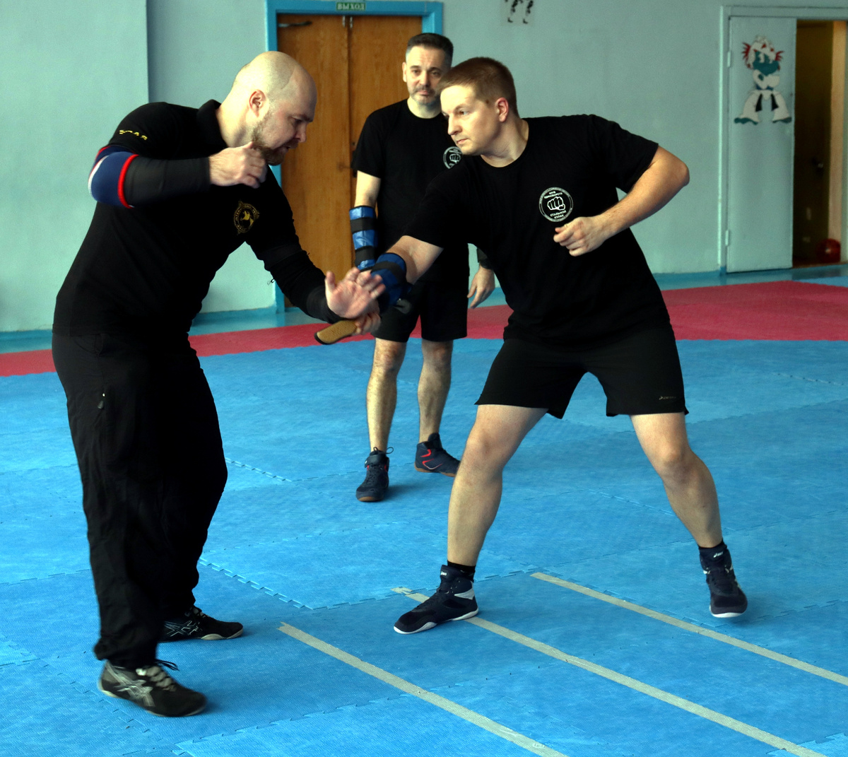Отрабатывали вариант двойного спринта: защита — отход, защита — уход! Схема такова: на атаку агрессора шла защита с отходом назад, и при повторной атаке сразу после защиты шел «старт» от противника.