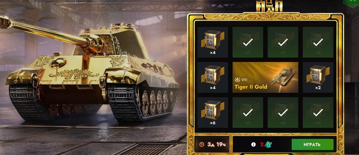 Может этот Королевский тигр из золота как-то отличается от прокачиваемого аналога в лучшую сторону? Нет. Наоборот, сводится на 0,01 секунды медленнее, да и светится в таком виде лучше, чем прокачка (ага, маскировка у него действительно хуже). И по ощущениям, критуется он (а именно двигатель) у золотого тигра намного чаще, чем у прокачиваемого. Может он будет очень редким эксклюзивом? Тоже нет. Ибо шансы его получение (у игроков, кто не имел Секретного экспоната) хоть и мизерные, но есть.