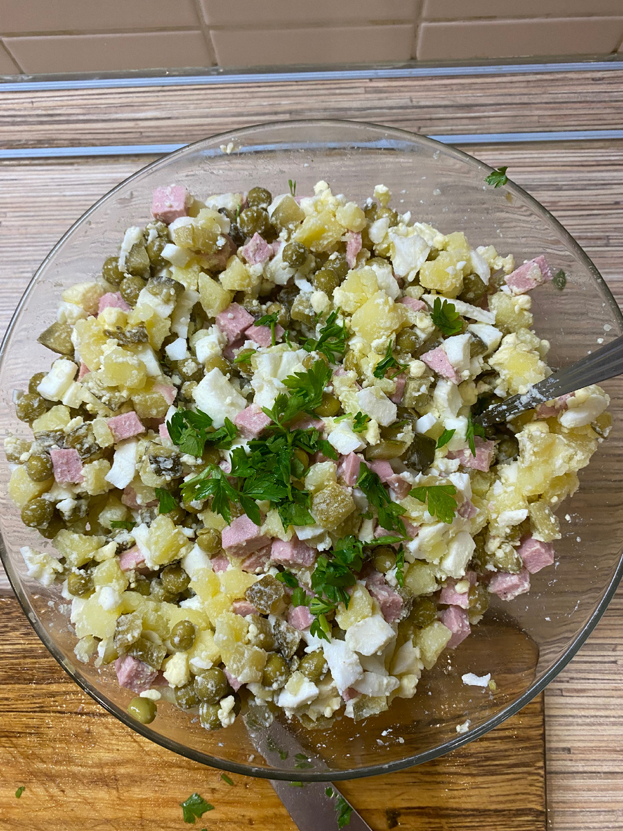 Салат Оливье — это неотъемлемая часть праздничного стола в России. Его любят за простоту приготовления и насыщенный вкус. Давайте рассмотрим классический рецепт этого знаменитого блюда. берем: колбаса вареная - 300 гр картофель - 4 штуки крупный яйцо - 7 штук огурцы маринованные - 6 штук зеленый горошек в банке - 1 банка майонез в готовое блюдо - по вкусу. Отварите картофель и яйца в разных кастрюлях до готовности (яйцо варить после закипания воды 15 минут), затем остудите и нарежьте кубиками. Нарезать колбасу как на фото Все нарезанное складываем в большую миску для салата (можно немного посолить если варили картофель и воду не солили) Нарезать соленые огурцы как на фото и выложить в миску к остальным нарезанным продуктам открыть банку с горошком слить воду с банки и попробовать горошек - если нормальный выложить все банку горошка в миску к остальным нарезанным продуктам Все вместе в миске перемешать аккуратно ложкой, украсить можно петрушкой совсем немного и приятного аппетит