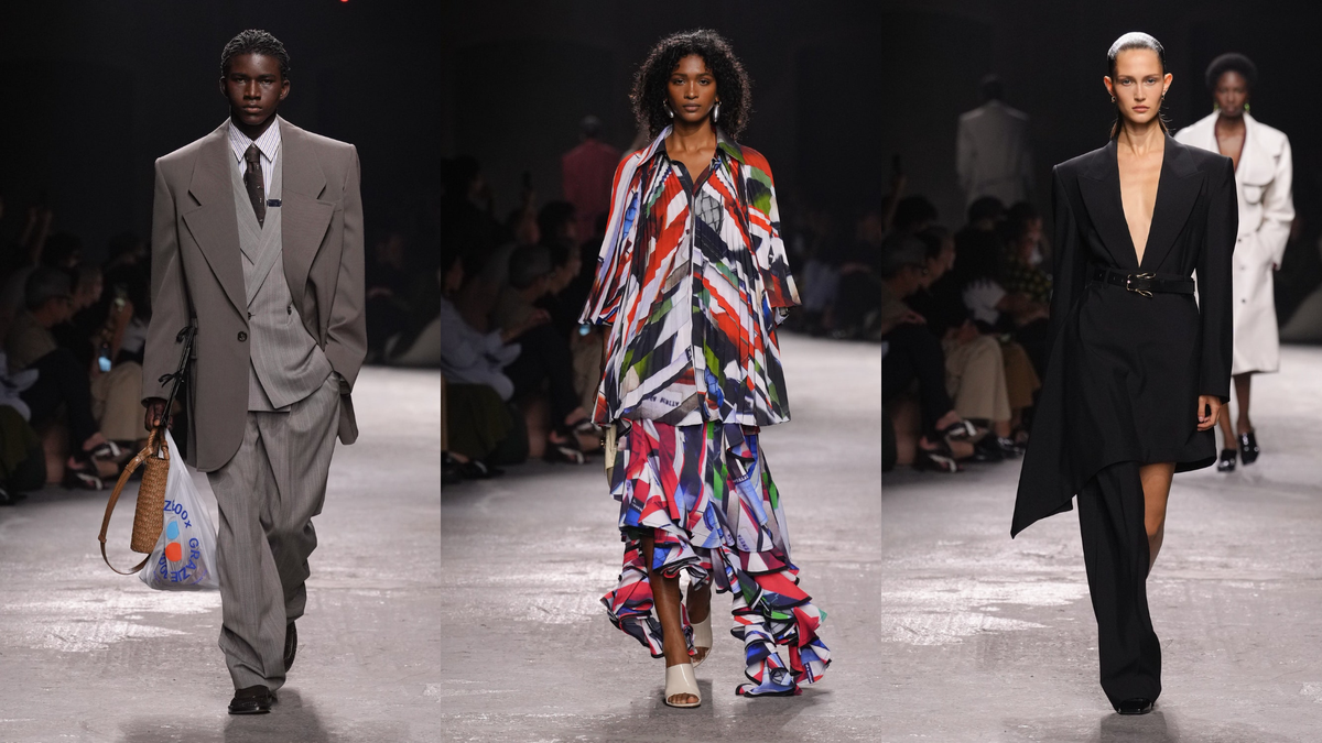 Маттье Блази действительно умеет создавать уникальную атмосферу. Кресла в форме животных — Мишель Йео на божьей коровке, Кендалл Дженнер на лошади, Джейкоб Элорди, новое лицо бренда, на зайце — мгновенно подняли настроение публике Bottega Veneta этим вечером. Это напомнило возвращение в детство, когда мы все сидели в игровой комнате, поджав колени, и с нетерпением ждали начала любимой телепередачи За два с половиной года Блази превратил показы Bottega Veneta в главное событие Миланской недели моды. Ключевую роль в этом играет его внимание к искусству и дизайну, а также тщательно подобранная публика. Среди гостей этого сезона были звезда TikTok Джулс Леброн и олимпийская чемпионка по боксу из Алжира Имэн Хелиф. Главная тема коллекции — это детство. «Меня привлекла идея детского восторга, того самого "вау", которое ты испытываешь, пробуя что-то новое. Это похоже на первобытное ощущение моды, когда впервые надеваешь одежду родителей», — рассказал он. Блази представил большие пиджаки и бр