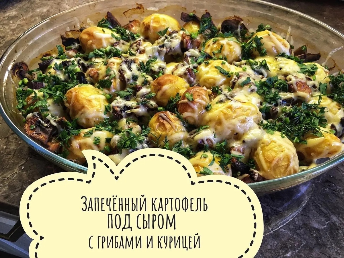 🥒Кабачки это летом прекрасно,...но.... 🥔Картошечка, да с грибочками, да с курочкой, да сырочком припорошить... Быстро, просто и вкусно. 👨👩👧👦И сыта, и довольна вся семья 🥘🍴 👩🏻🍳Ингредиенты: Картофель мелкий Филе курицы Шампиньоны Сыр Зелень Соль, перец, сушёная паприка, хмели-сунели, сушёный чеснок, чёрный молотый перец, немного соевого соуса или сметаны (все по вкусу) 👩🏻🍳Приготовление: Чистим картофель, филе режем кубиком, шампиньоны режем на 2 части. Соединяем все ингредиенты с солью и приправами, перемешиваем и отправляем запекать в духовку при 180* до готовности картофеля. Достаём, посыпаемся сыром и зеленью. Сыр тает на глазах. Приятного всем!!