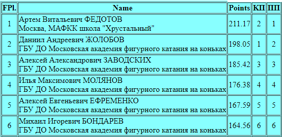 Отмечу музыкальный репертуар ("Король и шут") в произвольной программе у Ильи Молянова (176.38 - 4 место). В свои 16 лет ему надо уже усложняться, но пока прыжки ультра-си идут тяжело. Чистый прокат получился у Леши Заводских (185.42 - 3 место) из группы Наталии Марьянски, но при этом практически всем элементам не хватило качества исполнения, отсюда и техника лишь чуть выше 60 баллов. Лидировавший после короткой программы Даниил Жолобов (198.05 - 2 место) был очень доволен своим серебром. Попробовал зайти на четверной сальхов, но попытка была далека от того, чтобы оказаться успешной, а вот с тройными прыжками справился, хотя тройной лутц, как и раньше, вызывает некоторые проблемы. Илью и Даниила увидим на этапах Гран-при от Москвы, а вот Алексей в отборочном Первенстве участия не принимал.