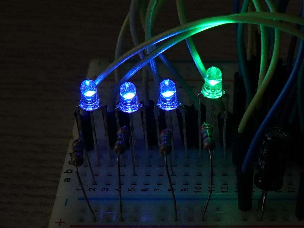 Классические бегущие огни можно сделать более разнообразными с помощью двухцветных светодиодов. На рисунке 1 изображена схема бегущих огней на D триггерах. В данной схеме D триггеры включены по схеме регистра сдвига. На таймере КР1006ВИ1(NE555) выполнен генератор тактовых импульсов. При включении питания цепочка R5, С7 создает импульс сброса, который подается на вход S первого триггера и входы R остальных триггеров. Кратковременная подача сигнала низкого уровня на вход S первого триггера переводит его в состояние логической единицы, при подаче этого сигнала на вход R остальных триггеров переводит их в состояние логического нуля. При подаче тактовых импульсов, состояние логической единицы передается от первого триггера к следующему. Если бегущие огни окажутся скучными, то D триггеры можно подключить по схеме делителя на 2, тогда каждый светодиод будет мигать со своей частотой. На рисунке 2 показан фрагмент схемы. На рисунке 3 показана схема с использованием неполярных светодиодов. На эт