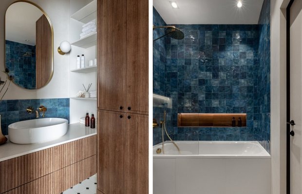 Классные идеи, которые мы подсмотрели в проекте дизайнера Этот яркий и стильный санузел оформила дизайнер Лили Кайсарова из студии Sloyarch в однокомнатной московской квартире 38 кв. м. Вдохновением для всего интерьера стали природные мотивы и атмосфера моря. Собрали модные и практичные решения, которые вдохновят вас на переделки. Разная отделка стен в зоне туалета и ванны визуально зонирует комнату. Заказчица любит синий цвет, поэтому стены над ванной и над раковиной облицевали плиткой в глубоком синем оттенке. Яркий насыщенный тон добавляет помещению свежести и напоминает о лазурном побережье. Смиксовали не только отделку и цвета, но и текстуры. Фактурная плитка, деревянные поверхности, фрезерованные фасады, латунная сантехника — интерьер выглядит интересно, динамично и дарит разнообразие тактильных ощущений. Над инсталляцией и на стене в зоне ванны спроектировали глубокие ниши. Это хороший способ максимально эффективно использовать площадь. На них удобно класть гигиенические принадл