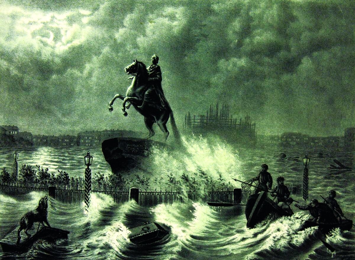 - Я проснулся за час перед полднем; говорят, что вода чрезвычайно велика, давно уже три раза выпалили с крепости, затопила всю нашу Коломну. Подхожу к окошку и вижу быстрый проток; волны пришибают к возвышенным тротуарам; скоро их захлестнуло; еще несколько минут — и черные пристенные столбики исчезли в грозной новорожденной реке. Она посекундно прибывала. Я закричал, чтобы выносили что понужнее в верхние жилья... Люди, несмотря на очевидную опасность, полагали, что до нас нескоро дойдет; бегаю, распоряжаюсь — и вот уже из-под полу выступают ручьи, в одно мгновение все мои комнаты потоплены; вынесли, что могли, в приспешную, которая на полтора аршина выше остальных покоев; еще полчаса — и тут воды со всех сторон нахлынули, люди с частию вещей перебрались на чердак; сам я нашел убежище во 2-м ярусе... В окна вид ужасный: где за час пролегала оживленная, проезжая улица, катились ярые волны с ревом и с пеною, вихри не умолкали. К театральной площади, от конца Торговой и со взморья, горизонт приметно понижается; оттуда бугры и холмы один на другом ложились в виде неудержимого водоската. Свирепые ветры дули прямо по протяжению улицы, порывом коих скоро воздымается бурная река. Она мгновенно мелким дождем прыщет в воздухе, и выше растет, и быстрее мчится. Между тем в людях мертвое молчание; конопать и двойные рамы не допускают слышать дальних отголосков, а вблизи ни одного звука ежедневного человеческого; ни одна лодка не появилась, чтобы воскресить упадшую надежду. Первая — гобвахта какая-то, сорванная с места, пронеслась к Кашину мосту, который тоже был сломлен и опрокинут; лошадь с дрожками долго боролась со смертию, наконец уступила напору и увлечена была из виду вон; потом поплыли беспрерывно связи, отломки от строений, дрова, бревна и доски — от судов ли разбитых, от домов ли разрушенных, различить было невозможно. Вид стеснен был противустоящими домами; я через смежную квартиру... побежал и взобрался под самую кровлю, раскрыл все слуховые окна. Ветер сильнейший, и в панораме — пространное зрелище бедствий. С правой стороны (стоя задом к Торговой) поперечный рукав наместо улицы между Офицерской и Торговой; далее часть площади в виде широкого залива, прямо и слева Офицерская и Английский проспект и множество перекрестков, где водоворот сносил громады мостовых развалин; они плотно спирались, их с тротуаров вскоре отбивало; в самой отдаленности хаос, океан, смутное смешение хлябей, которые отвсюду обтекали видимую часть города, а в соседних дворах примечал я, как вода приступала к дровяным запасам, разбирала по частям, по кускам и их, и бочки, ушаты, повозки и уносила в общую пучину, где ветры не давали им запружать каналы: все изломанное в щепки неслось, влеклось неудержимым, неотразимым стремлением. Гибнущих людей я не видал, но, сошедши несколько ступеней, узнал, что пятнадцать детей, цепляясь, перелезли по кровлям и еще не опрокинутым загородам, спаслись в людскую, к хозяину дома, в форточку, также одна (калека), которая на этот раз одарена была необыкновенною у пру гостию членов. Все это осиротело. Где отцы их, матери!!! Возвратясь в залу... я уже нашел, по сравнению с прежним наблюдением, что вода нижние этажи иные совершенно залила, а в других поднялась до вторых косяков 3-х стекольных больших окончин, вообще до 4-х аршин уличной поверхности. Был тр