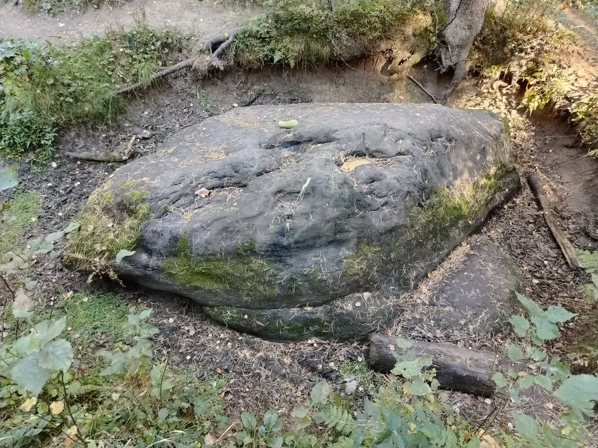 В статье Игоря Маланина «Материалы разведки Синих камней Подмосковья в 2003 году», упоминается камень возле деревни Веледниково. Данный Синий мегалит - древний поклонный камень Велеса,, один из шести найденных-подтвержденных Синих камней Подмосковья. Читай - https://www.bogorodsk-noginsk.ru/atlas/sinie_kamni.html Видимая часть мегалита в длину около 3х метров, под водой рва скрыто еще 1,5 метра, мне повезло, я пришел в сухую погоду. В камне имеются искусственные чаши, одна из чаш скорее всего естественная с человеческими доработками. «Чашки» или «следы» – естественные или искусственные углубления. (прим. автора) Вода, после дождей или таяния снега из этих чаш считалась целебной. В чашках приносились жертвы Велесу в виде колосьев, яг