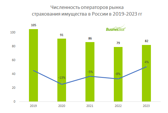 В 2019-2023 гг численность страховщиков на рынке страхования имущества в России сократилась на 22%: со 105 до 82 компаний.