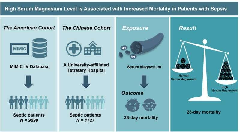 Сепсис — это опасное для жизни состояние, которое часто встречается в отделениях интенсивной терапии. В 2017 году во всем мире было зарегистрировано около 48,9 миллионов случаев сепсиса, что составляет 19,7% от общей глобальной смертности. Учитывая серьезность этой проблемы, Всемирная организация здравоохранения (ВОЗ) классифицировала сепсис как глобальный приоритет здравоохранения. Раннее выявление и своевременное вмешательство играют ключевую роль в лечении сепсиса и септического шока, существенно влияя на результаты лечения пациентов. Поэтому проведение стратификации рисков является особенно важным этапом в процессе. Недавнее международное многоцентровое исследование, проведенное командой доктора Бо Ху (Bo Hu) из Уханьского университета (Wuhan University) в Китае, выявило тесную связь между высокими уровнями магния в сыворотке крови и повышенным риском 28-дневной смертности у пациентов с сепсисом. В исследовании были проанализированы данные 10 826 пациентов с сепсисом, проживающих в