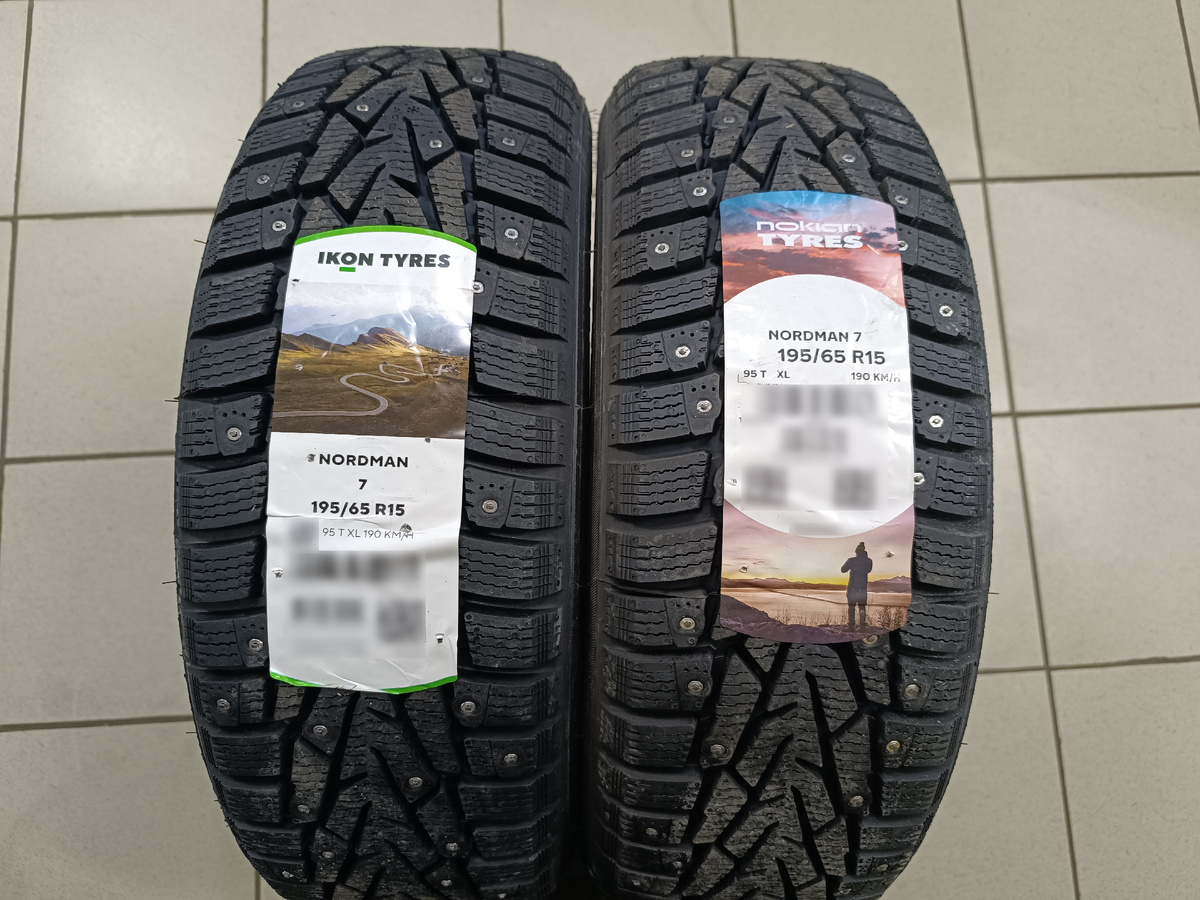 Сейчас у меня перед глазами две шины, Nokian Nordman 7 и Ikon Nordman 7. Будем рассматривать шины в одном и том же размере, чтобы было проще понять разницу. Сразу видим разные наклейки на протекторе, у нового бренда сохранен стиль дизайна предшественника, но и отличия тоже есть.