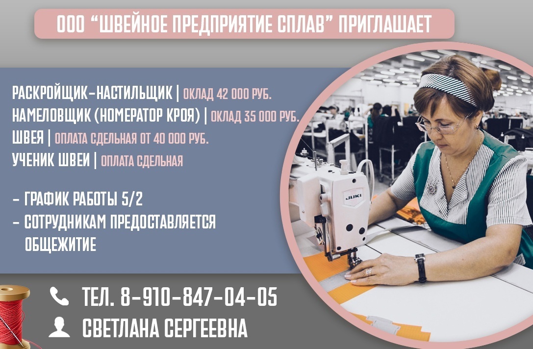 ООО «Швейное предприятие СПЛАВ» приглашает: * Раскройщика-настильщика (оклад 42000 руб.)