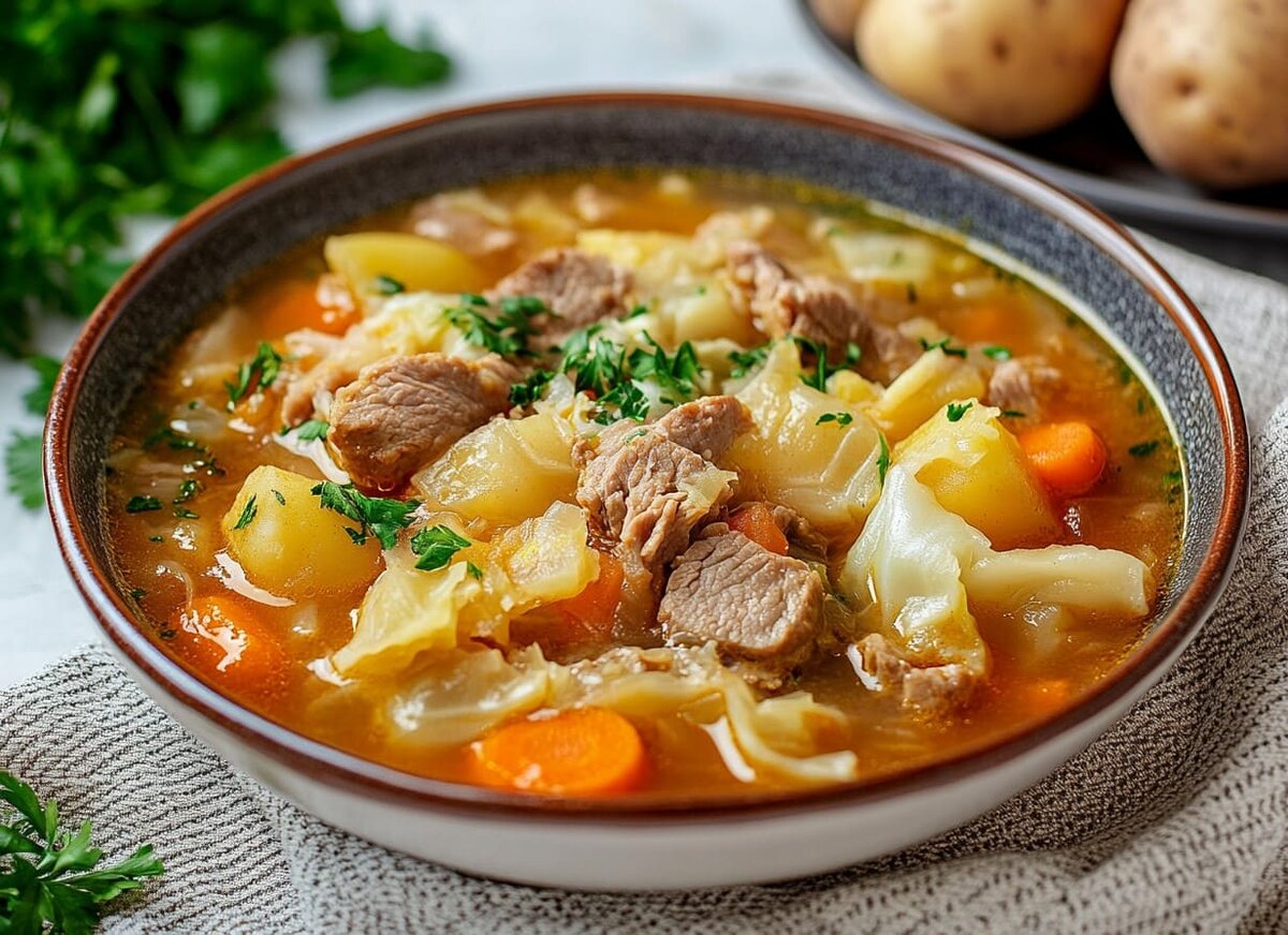 Щи из свежей капусты — это одно из самых популярных и традиционных русских блюд, ароматное и сытное, прекрасно согревает и насыщает. Щи готовят с различными видами мяса, и классический рецепт включает говядину, которая придает супу насыщенный вкус. Это отличное первое блюдо для обеда, которое можно подавать с ржаным хлебом и сметаной. Говядина (на кости или мякоть) – 500 г Капуста белокочанная (свежая) – 400 г Картофель – 3 шт. (среднего размера) Морковь – 1 шт. Лук репчатый – 1 шт. Томатная паста – 2 ст. л. Чеснок(по желанию) – 2 зубчика Лавровый лист – 2 шт. Чёрный перец горошком – 5 шт. Зелень (укроп, петрушка) – для украшения Соль – по вкусу Вода – 2 литра Приятного аппетита! Подписывайтесь на канал "Вкусно Очень"