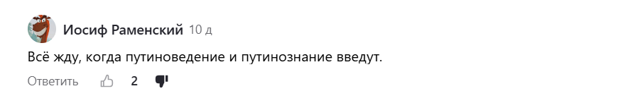 Если лет 10-15 назад подобные комментарии могли показаться остроумными, ибо определённые признаки "культа личности" в воздухе висели, поэтому было вполне возможно, что подобные странные перегибы нас накроют, то сейчас писать такое - выдавать свою непроходимую тупость и полное непонимание происходящих в стране процессов. Развитие нашей страны и её внешняя, да даже и внутренняя, политика никак не зависит от личности первого (второго, третьего и так далее) лица, ею управляющего - собственно, при замене лица любым другим ничего глобально не изменится. Хотя, конечно, в учебниках по современной истории действующего главу государства хвалят. Но изучать его биографию, как это, например, делается в Северной Корее или Туркмении, у которых руководители рассматриваются, почти как в Средние Века, Божьими наместниками (с поправкой на нерелигиозность соответствующих сообществ) - какой смысл? Много лет спустя, когда руководитель страны отправится в мир иной, ему посвятят пару дополнительных абзацев в тех же самых учебниках: если всё пойдёт нормально, то это будут такие же хвалебные абзацы, как и сейчас; если нет - впишут туда непопулярную нынче точку зрения о кровавом тиране (Иван Грозный и Иосиф Сталин уже таких характеристик удостоились - и ничего, для многих оба остаются величайшими первыми лицами в истории). Но отдельный предмет на изучение пусть и весьма авторитетного долговременного руководителя страны? С чего бы?