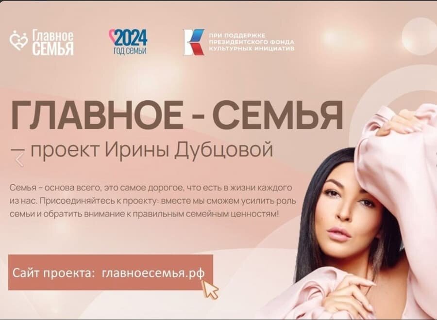 При поддержке Президентского фонда культурных инициатив проводится всероссийский конкурс “Главное - Семья”, направленный на укрепление семейных ценностей и поддержку семейных традиций. Проект, инициированный Ириной Дубцовой, ставит своей целью напомнить о культурном коде нашей страны и привлечь внимание к традиционным семейным ценностям через интернет, телевидение и креативную индустрию. В рамках конкурса семьи из разных уголков России смогут продемонстрировать свои таланты и сплоченность. Подать заявку можно в следующих номинациях : - Молодая семья ( семьи до 5 лет в браке ), - Многодетная семья, - Спортивная семья, - Творческая семья, - Профессиональная династия, - Семьи-юбиляры. Этапы проекта: - с 8 августа по 20 октября 2024 года - отборочный тур, отбор фото и видеороликов, в каждой номинации определят 3-5 лауреатов; - с 24 по 27 октября 2024 года - жюри путём закрытого голосования выберет одного победителя в каждой номинации; - 28 октября 2024 года - публикация результатов; - 28 н