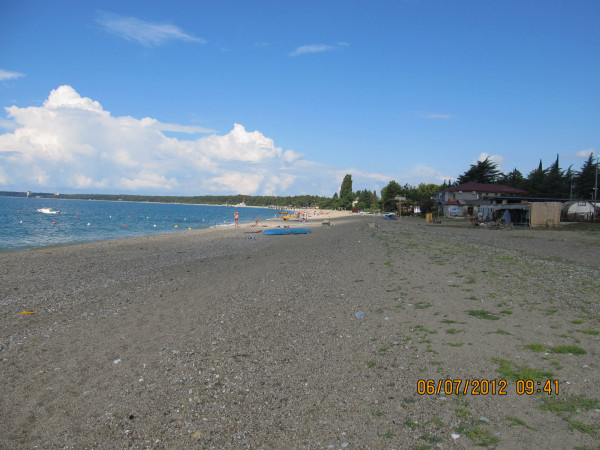 Была у нас мечта - дойти берегом моря до Амбары - старого храма, расположенного "мы точно не знаем где, но предполагаем, что за Мюссерой". Мюссера, или Мысра (по-абхазски) - это посёлок в 14 км от основной абхазской трассы и километрах в пяти от моря (но это выяснилось позже, при фатальных обстоятельствах). Идти мы туда планировали от Пицунды, точнее, от рыбзавода. Туда мы приехали рано утречком и пошли на пляж.