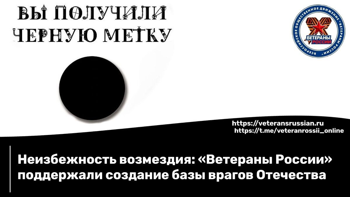 Общероссийское общественное движение «Ветераны России» поддержало инициативу заместителя председателя Совета безопасности РФ Дмитрия Медведева о создании открытой базы данных врагов нашего многонационального Отечества. Движение готово оказать всю необходимую информационную и организационную помощь в выявлении, установлении местонахождения и наказании всех этих лиц. В рамках этого, «Ветераны России» предлагают назвать национальный реестр предателей «Черная метка». Это будет символом неизбежного наказания для всех, кто совершает преступления против Родины и призывает к ударам по мирным гражданам.