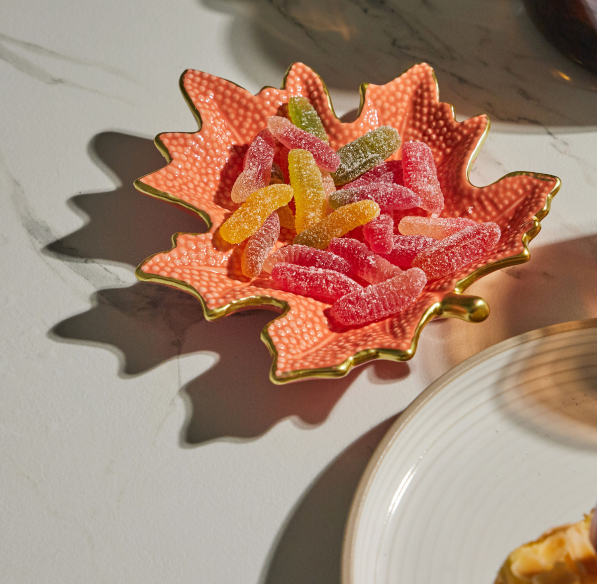 Очень симпатичные кленовые листочки. Оранжевая тарелочка лист сделана из керамики. Размер 16 см. Сервировочное блюдо внизу сделано из дерева. Я такое блюдо в прошлом году купила за 500 р. А потом цена взлетела. Размер 33,8*30*3 см.