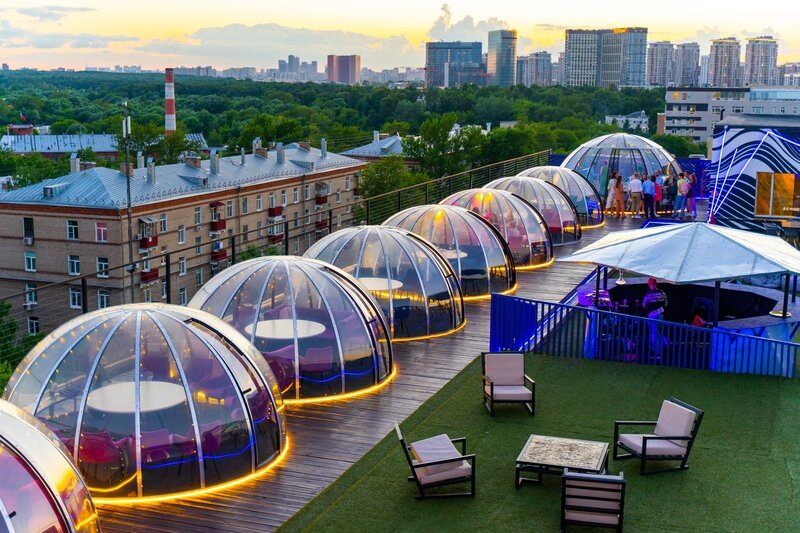 Пространство RoofTop расположено рядом с популярными достопримечательностями Москвы, ВДНХ, парком "Останкино" и Ботаническим садом. С высоты открывается впечатляющий вид на город, который придаст празднику неповторимую атмосферу. Вы можете принести свою еду и напитки или заказать блюда от Imba Kitchen, партнёра Roof Top. Кроме того, действуют пакетные предложения для любого мероприятия под ключ, вам останется только наслаждаться праздником, а все организационные вопросы площадка возьмёт на себя. На площадке находятся 18 прозрачных купольных беседок, оборудованных всем необходимым для комфортного отдыха. За счёт системы климат-контроля в беседках поддерживается постоянная температура, в них приятно находиться при любой погоде. Гости располагаются на мягких диванах и в уютных креслах, также есть колонки, микрофон, караоке, стильная неоновая подсветка. Здесь можно почувствовать себя ближе к небу, провожать закаты и любоваться Москвой. Провести мероприятие можно не только в