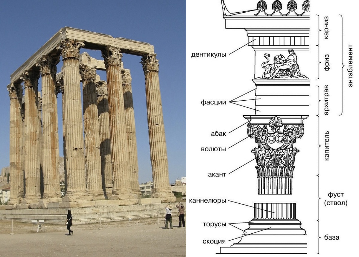 Как и в ионическом, колонна коринфского ордера имеет базу и фуст, прорезанный каннелюрами.