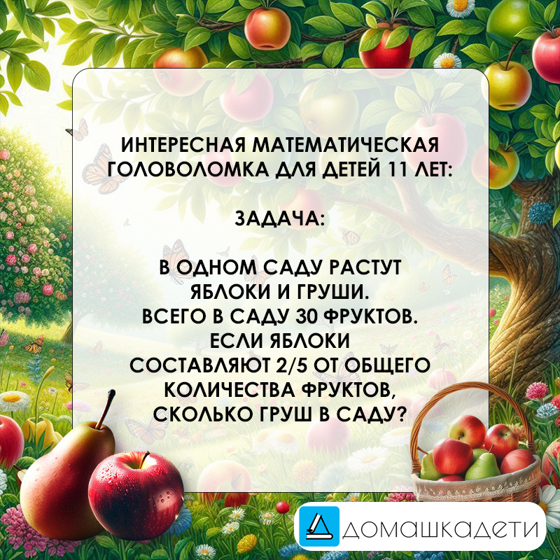 Ответ: Сколько груш в саду? 🍐🍏 Почему стоит записаться на онлайн занятия именно на нашем сайте Домашка.Дети? На Домашка.Дети мы не просто учим, а действительно объясняем! Наши преподаватели делают акцент на понимании материала, а не на механическом запоминании. Мы хотим, чтобы ваши дети стали самостоятельными и уверенными в себе. После занятий у вашего ребенка появится не только умение решать такие задачи, но и уверенность в своих силах. Мы поможем им освоить математику так, чтобы они мо